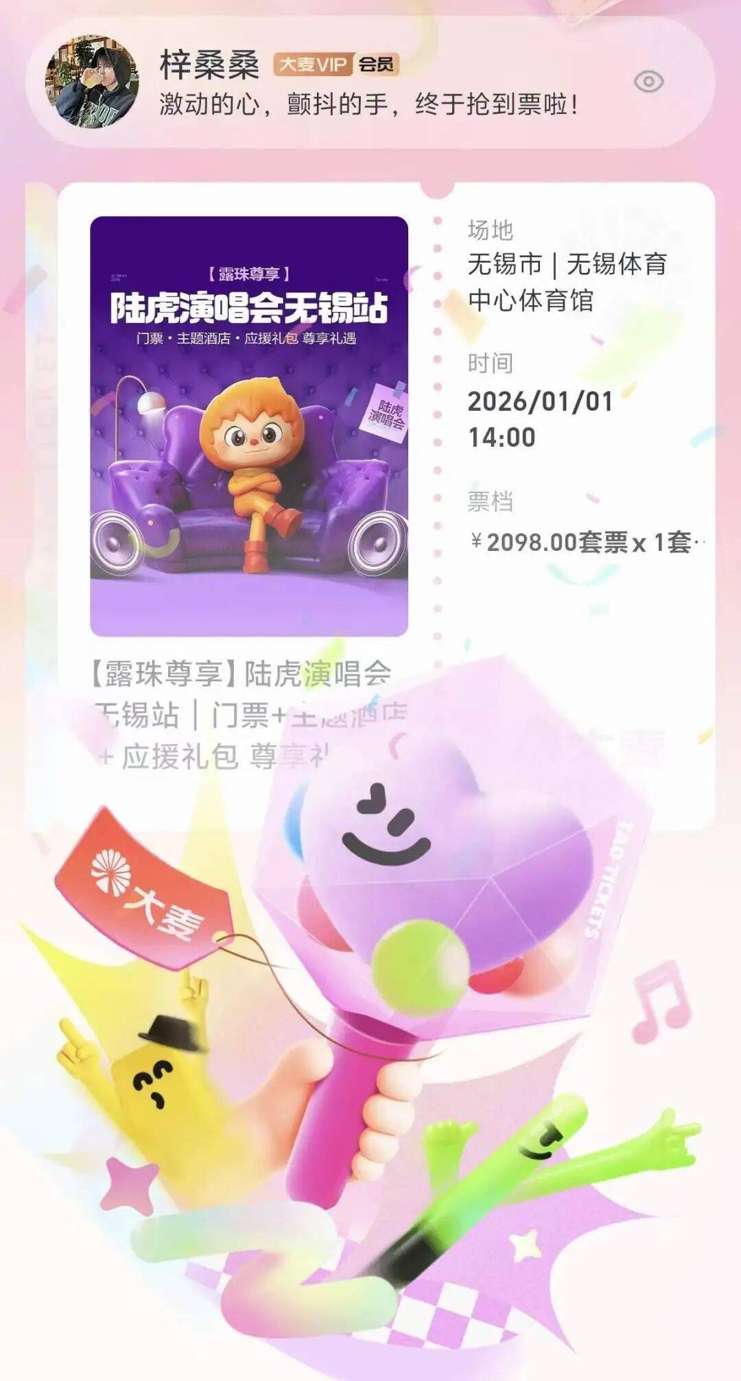 颇为喜爱0713再就业男团的梓桑,当即与自己的观演搭子约好一起抢套票,去无锡看陆虎演唱会跨年。