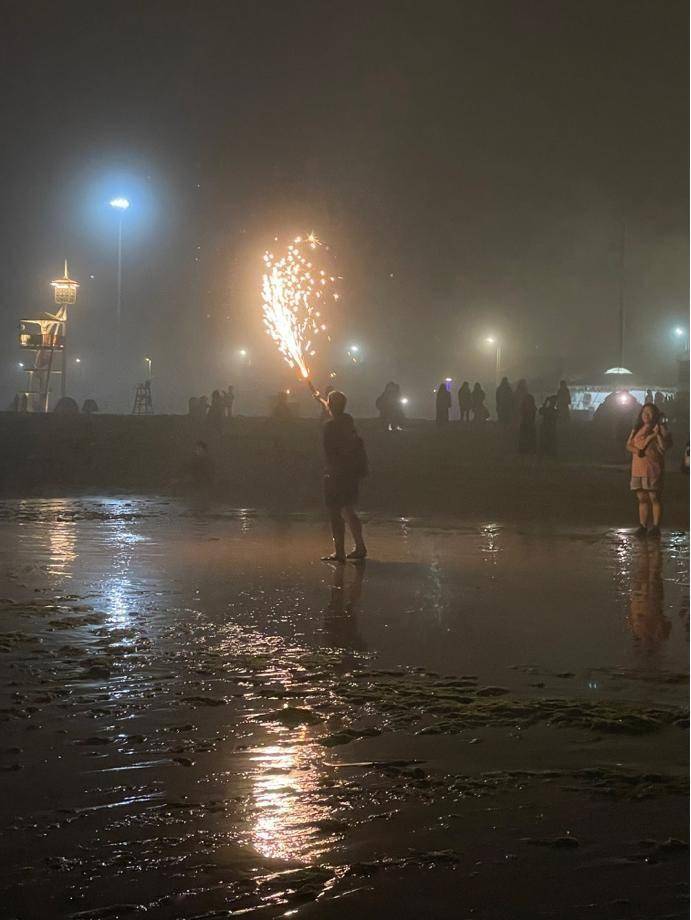 从剧场离开后,朱球球又和朋友们来到附近的海边,在海滩上点燃仙女棒。照片也定格下月光与烟火洒落的瞬间。“人生中有很多个过零点的时刻,但这一定是最美好的一次。”